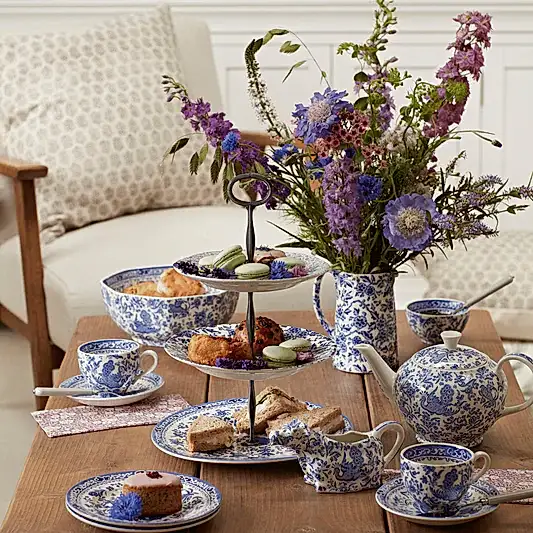 Our English teapots are available in all of your favourite Burleigh prints, including our traditional blue and white designs, such as Blue Calico, Arden, Felicity, Regal Peacock, and Asiatic Pheasants. We also have contemporary designs, including Black Regal Peacock and Pink Asiatic Pheasants teapots that can be mixed and matched with our teacups and saucers and cake stands.